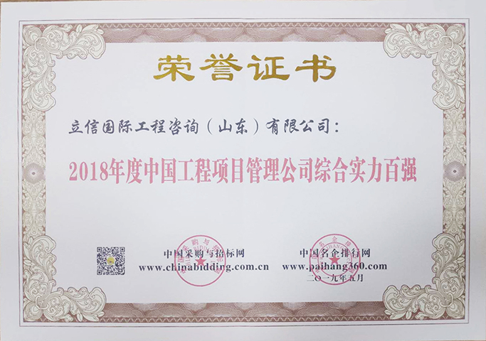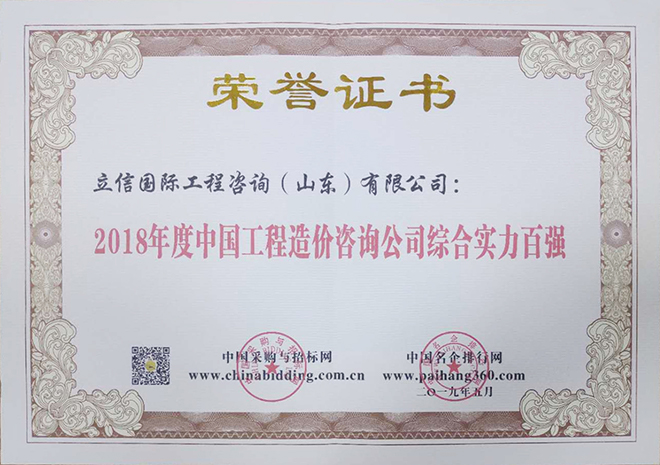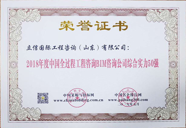 2019年5月,在“2019第13屆全國招投標領(lǐng)域年度聚焦暨全過程工程咨詢機構(gòu)評價推介”活動中,立信國際工程咨詢(山東)有限公司獲得如下榮譽: 2018年度中國全過程工程咨詢公司綜合實力百強 2018年度中國工程造價咨詢公司綜合實力百強 2018年度中國工程項目管理公司綜合實力百強 2018年度中國全過程工程咨詢BIM咨詢公司綜合實力50強