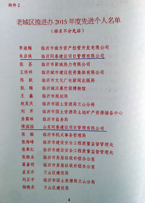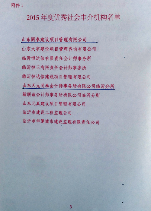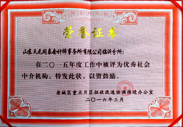 | 祝賀“同泰”獲臨沂市老城區(qū)推進辦“2015年度優(yōu)秀中介機構(gòu)”! |