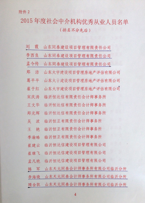 2015年,在臨沂市老城區(qū)重點片區(qū)征收改造協(xié)調(diào)推進辦公室領(lǐng)導(dǎo)下,我所選派業(yè)務(wù)骨干參與老城區(qū)征收改造和開發(fā)建設(shè)工作,發(fā)揚謙虛謹慎、愛崗敬業(yè)、干事創(chuàng)業(yè)、無私奉獻精神,圓滿完成了臨沂市老城區(qū)重點片區(qū)征收改造協(xié)調(diào)推進辦公室領(lǐng)導(dǎo)交辦的跟蹤審計、工程咨詢、評估等工作任務(wù),展示出“同泰”人的水平和實力,為事務(wù)所創(chuàng)造經(jīng)濟效益。