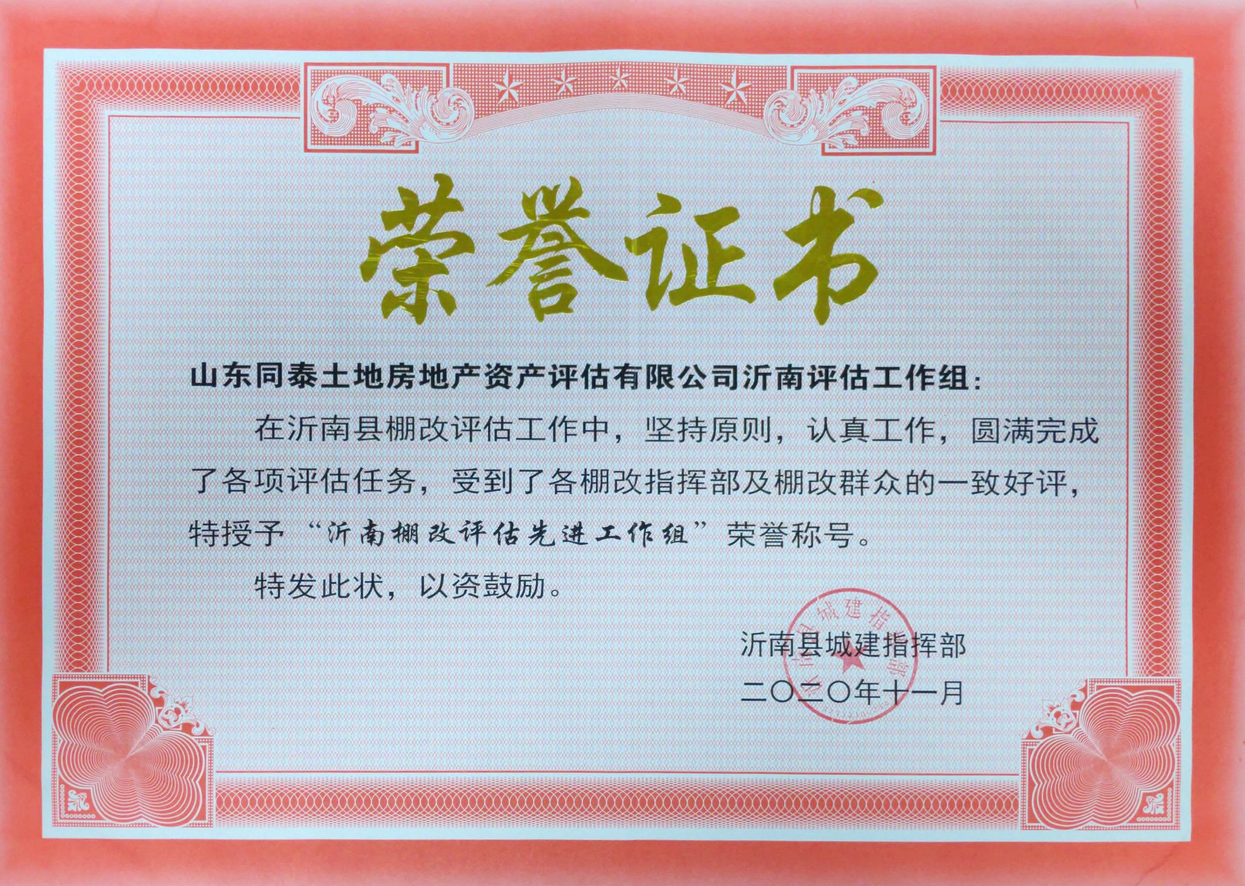山東同泰土地房地產(chǎn)資產(chǎn)評(píng)估有限公司: 貴單位派出的評(píng)估工作組,在沂南縣棚戶區(qū)改造及國(guó)有土地房屋征收評(píng)估工作中,始終堅(jiān)持獨(dú)立、客觀、公平、公正的工作原則,不畏工作環(huán)境的艱苦與惡劣,均能堅(jiān)持認(rèn)真、準(zhǔn)確、高質(zhì)量地完成沂南縣棚戶區(qū)改造及房屋征收工作。2017年,沂南縣啟動(dòng)棚改項(xiàng)目,至今已棚改集體村居16個(gè),棚改11700余戶,棚改面積179.2萬(wàn)平方米,評(píng)估值達(dá)18.9億元;實(shí)施國(guó)有土地上房屋征收項(xiàng)目2個(gè),被征收房屋2100余戶,征收面積22.71萬(wàn)平方米,評(píng)估值達(dá)10.99億元。以姜杰同志為首的評(píng)估工作組憑借專業(yè)知識(shí)和過(guò)硬素質(zhì)圓滿完成了各項(xiàng)評(píng)估任務(wù)。 評(píng)估工作組在西山小區(qū)房屋征收評(píng)估中,在棚改第一村界湖北村評(píng)估中,晚上加班為常態(tài),積極配合指揮部從專業(yè)角度解決各種問(wèn)題。面對(duì)被征收戶各種不理解和刁難,以及被征收戶希望通過(guò)送煙酒、送錢卡得到不當(dāng)利益時(shí),評(píng)估工作組始終堅(jiān)持公正評(píng)估原則、委婉禮貌回絕,既保證了評(píng)估工作的公平公正,也保證了被征收戶的合法利益,他們這種工作態(tài)度贏得了廣大征收戶的理解和肯定。 四年來(lái),無(wú)論是酷暑難耐的夏季,還是冰天凍地的冬天,評(píng)估工作組都一一親臨現(xiàn)場(chǎng)清點(diǎn)測(cè)量拍照,認(rèn)真核實(shí)反復(fù)核對(duì)每一組數(shù)據(jù),確保準(zhǔn)確無(wú)誤,也為項(xiàng)目加快進(jìn)度爭(zhēng)取了寶貴時(shí)間。 四年來(lái),評(píng)估工作組在沂南的工作得到了東、西、南、北以及老舊小區(qū)等棚改指揮部的一致好評(píng)和認(rèn)可。貴單位這種認(rèn)真的工作態(tài)度,嚴(yán)謹(jǐn)?shù)墓ぷ髯黠L(fēng)在評(píng)估工作組每一名成員身上都得到了充分體現(xiàn)。評(píng)估工作組這種對(duì)待工作高度負(fù)責(zé),熱愛(ài)本職、堅(jiān)持原則、不怕吃苦、實(shí)事求是的工作態(tài)度和優(yōu)秀品德也值得我們大家好好學(xué)習(xí)。為此,特對(duì)貴單位沂南評(píng)估工作組提出表?yè)P(yáng)!建議貴單位對(duì)沂南評(píng)估工作組工作人員給予獎(jiǎng)勵(lì)。 此致 沂南縣城建指揮部辦公室 2020年11月16日