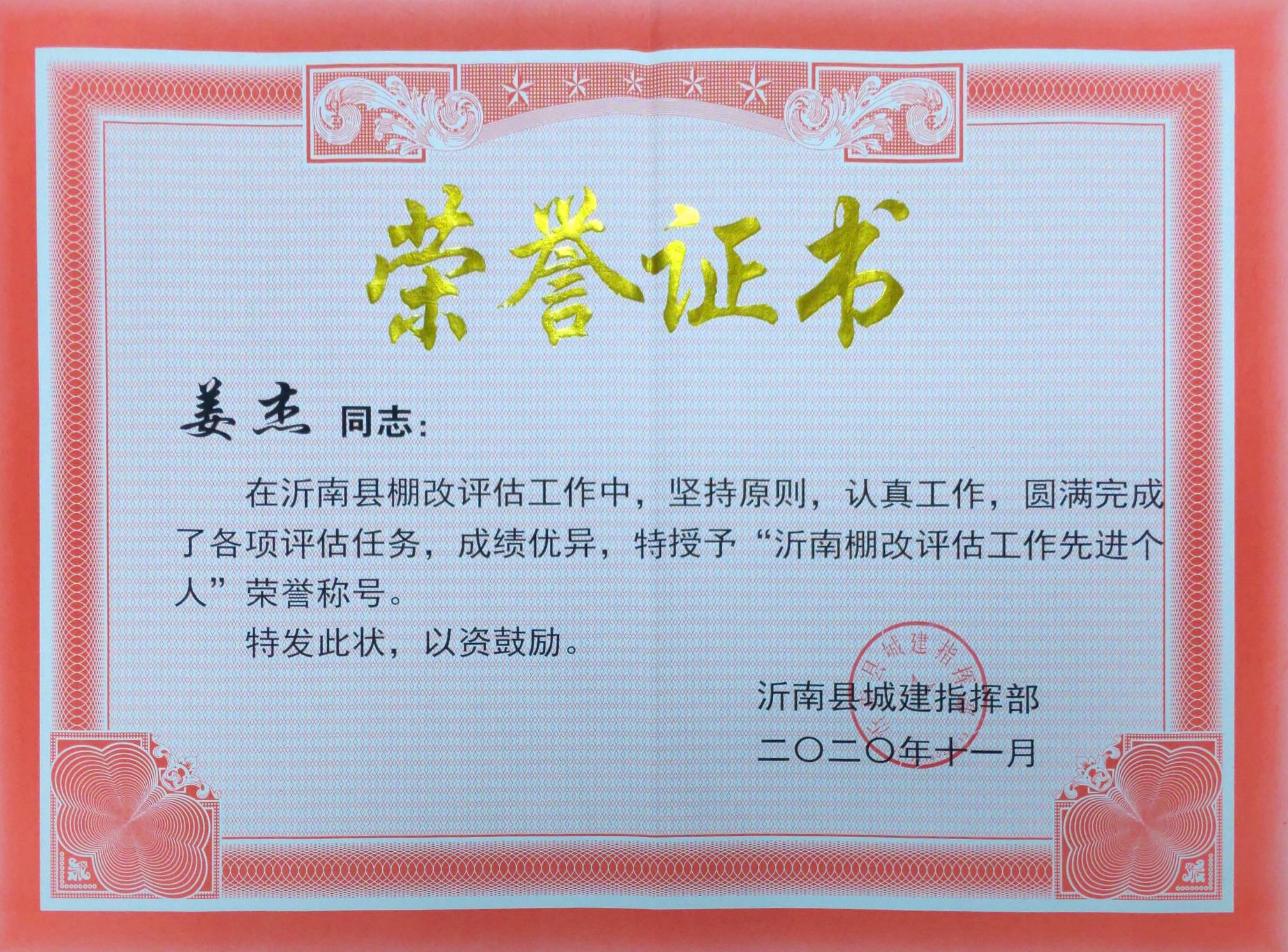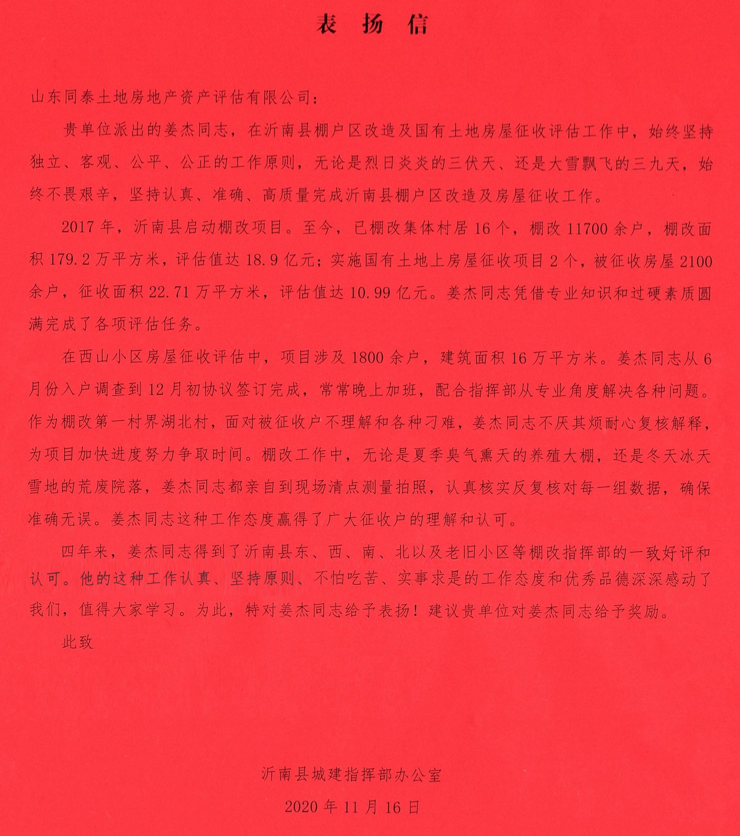 表?yè)P(yáng)信 山東同泰土地房地產(chǎn)資產(chǎn)評(píng)估有限公司: 貴單位派出的姜杰同志,在沂南縣棚戶區(qū)改造及國(guó)有土地房屋征收評(píng)估工作中,始終堅(jiān)持獨(dú)立、客觀、公平、公正的工作原則,無(wú)論是烈日炎炎的三伏天、還是大雪飄飛的三九天,始終不畏艱辛,堅(jiān)持認(rèn)真、準(zhǔn)確、高質(zhì)量完成沂南縣棚戶區(qū)改造及房屋征收工作。 2017年,沂南縣啟動(dòng)棚改項(xiàng)目。至今,已棚改集體村居16個(gè),棚改11700余戶,棚改面積179.2萬(wàn)平方米,評(píng)估值達(dá)18.9億元;實(shí)施國(guó)有土地上房屋征收項(xiàng)目2個(gè),被征收房屋2100余戶,征收面積22.71萬(wàn)平方米,評(píng)估值達(dá)10.99億元。姜杰同志憑借專業(yè)知識(shí)和過(guò)硬素質(zhì)圓滿完成了各項(xiàng)評(píng)估任務(wù)。 在西山小區(qū)房屋征收評(píng)估中,項(xiàng)目涉及1800余戶,建筑面積16萬(wàn)平方米。姜杰同志從6月份入戶調(diào)查到12月初協(xié)議簽訂完成,常常晚上加班,配合指揮部從專業(yè)角度解決各種問(wèn)題。作為棚改第一村界湖北村,面對(duì)被征收戶不理解和各種刁難,姜杰同志不厭其煩耐心復(fù)核解釋,為項(xiàng)目加快進(jìn)度努力爭(zhēng)取時(shí)間。棚改工作中,無(wú)論是夏季臭氣熏天的養(yǎng)殖大棚,還是冬天冰天雪地的荒廢院落,姜杰同志都親自到現(xiàn)場(chǎng)清點(diǎn)測(cè)量拍照,認(rèn)真核實(shí)反復(fù)核對(duì)每一組數(shù)據(jù),確保準(zhǔn)確無(wú)誤。姜杰同志這種工作態(tài)度贏得了廣大征收戶的理解和認(rèn)可。 四年來(lái),姜杰同志得到了沂南縣東、西、南、北以及老舊小區(qū)等棚改指揮部的一致好評(píng)和認(rèn)可。他的這種工作認(rèn)真、堅(jiān)持原則、不怕吃苦、實(shí)事求是的工作態(tài)度和優(yōu)秀品德深深感動(dòng)了我們,值得大家學(xué)習(xí)。為此,特對(duì)姜杰同志給予表?yè)P(yáng)!建議貴單位對(duì)姜杰同志給予獎(jiǎng)勵(lì)。 此致沂南縣城建指揮部辦公室 2020年11月16日