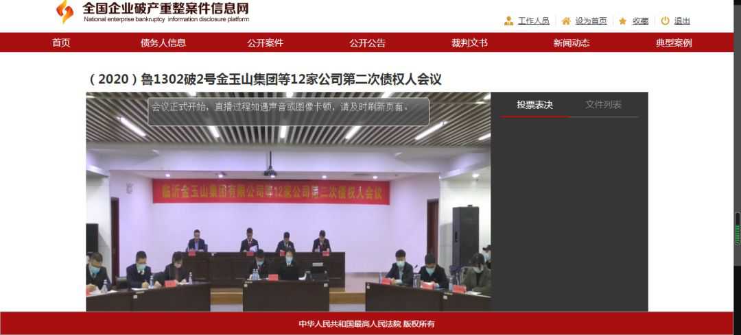 會(huì)議開始后,由臨沂市蘭山區(qū)人民法院合議庭書記員朱靜怡宣讀會(huì)場(chǎng)紀(jì)律,會(huì)議議程第一項(xiàng):合議庭介紹案件進(jìn)展情況;第二項(xiàng):管理人代表尹昌鳳作《管理人履職工作報(bào)告》;第三項(xiàng):審計(jì)機(jī)構(gòu)代表李敏作《審計(jì)工作情況說明》;第四項(xiàng):評(píng)估機(jī)構(gòu)代表趙常鑫作《評(píng)估工作情況說明》;第五項(xiàng):管理人代表孔鵬作《關(guān)于補(bǔ)充申報(bào)債權(quán)核查的報(bào)告》;第六項(xiàng):管理人代表孔鵬公布《臨沂金玉山集團(tuán)有限公司等十二家公司合并重整計(jì)劃(草案)》并進(jìn)行介紹;第七項(xiàng):管理人代表范昌龍宣讀《債權(quán)人會(huì)議表決規(guī)則》;第八項(xiàng):合議庭宣讀臨時(shí)表決權(quán)決定書;第九項(xiàng):山東省臨沂市沂蒙公證處宣讀第二次債權(quán)人會(huì)議線下表決結(jié)果公證情況;第十項(xiàng):未表決的債權(quán)人進(jìn)行線上表決并由管理人統(tǒng)計(jì)表決結(jié)果;第十一項(xiàng):公布表決結(jié)果,本次會(huì)議上,全部債權(quán)組表決通過重整計(jì)劃草案。歷時(shí)一年,臨沂金玉山集團(tuán)有限公司等十二家重整成功!