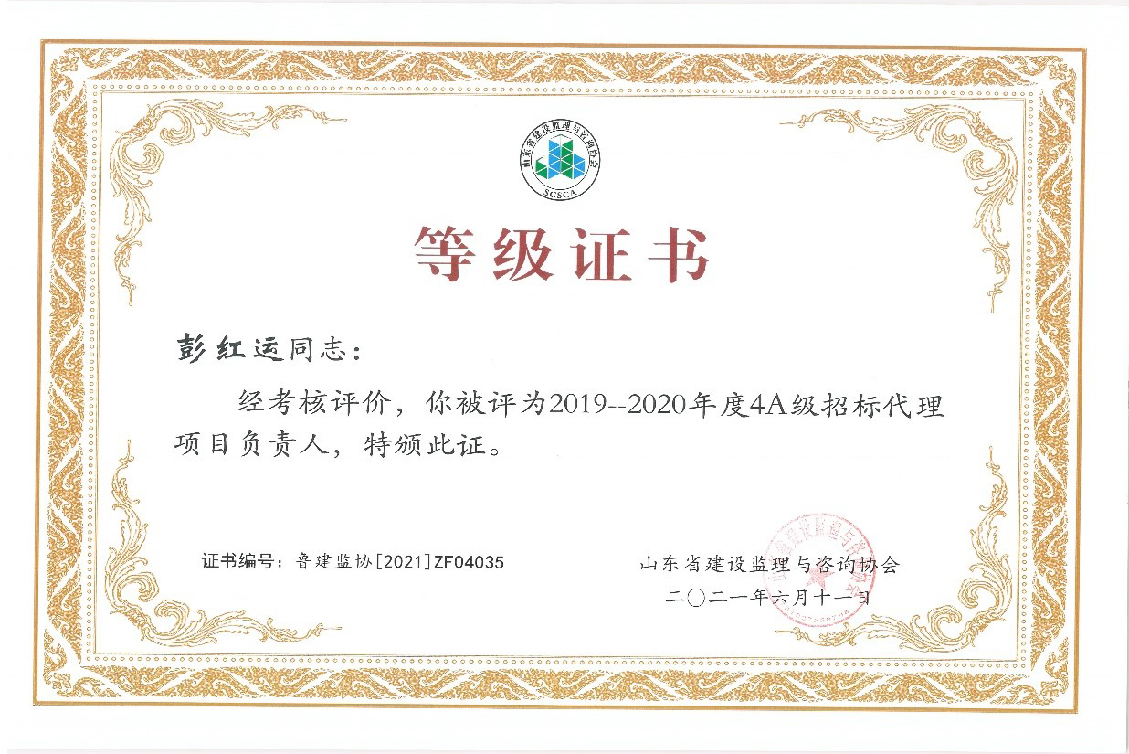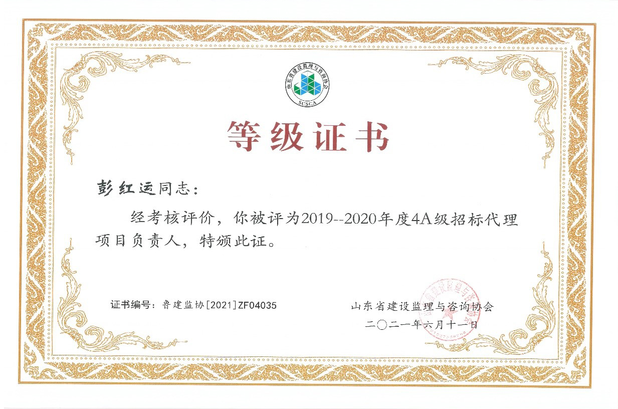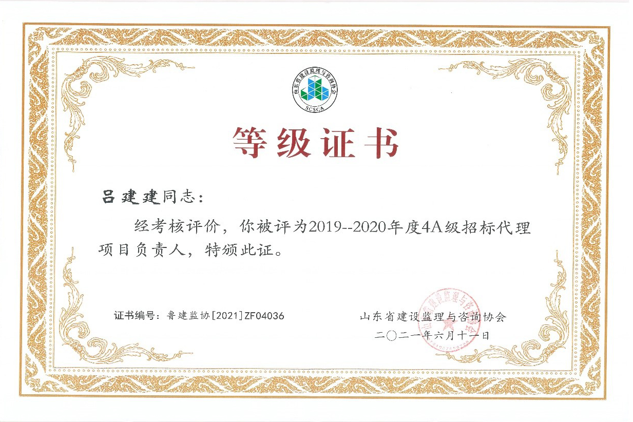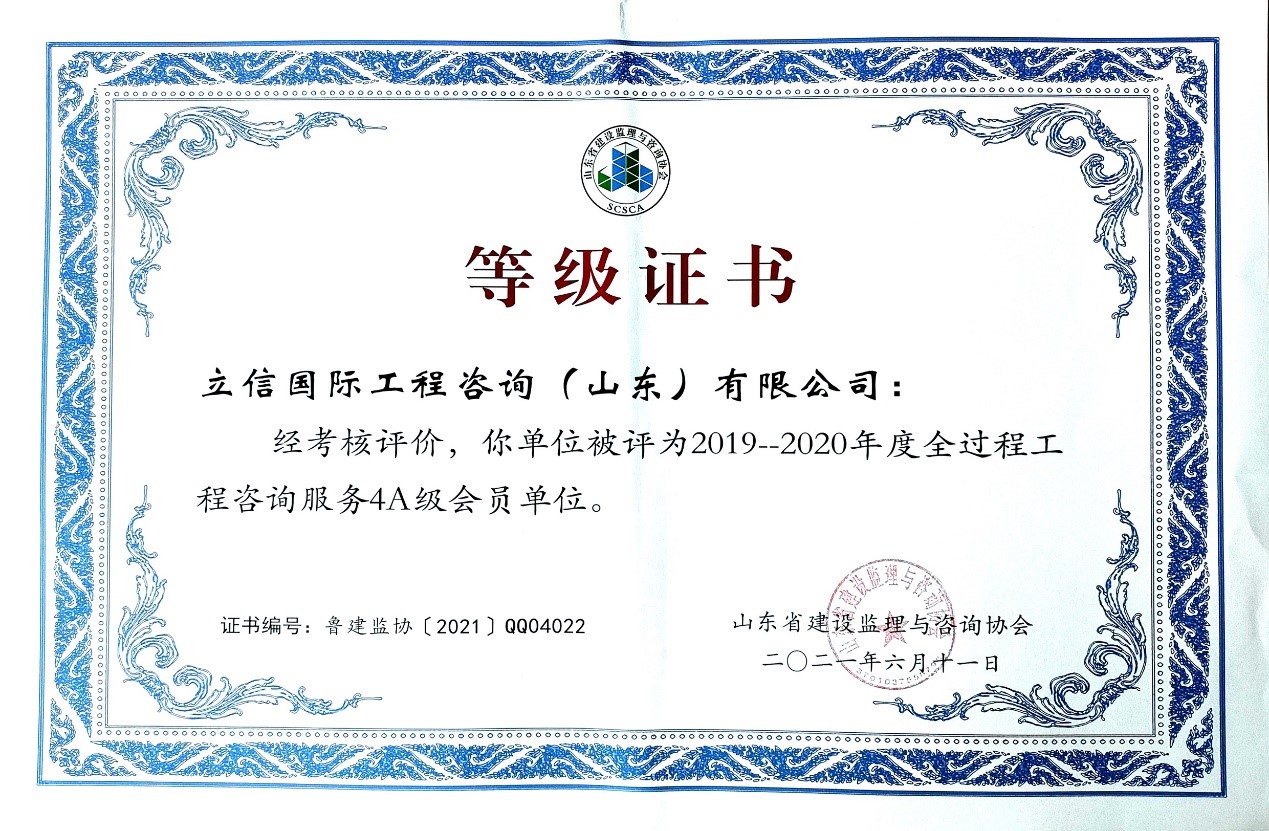 2021年6月,山東省建設(shè)監(jiān)理與咨詢協(xié)會、臨沂市建設(shè)監(jiān)理協(xié)會分別開展了有關(guān)全過程咨詢服務(wù)、監(jiān)理等業(yè)務(wù)的各項綜合考評,立信國際工程咨詢(山東)有限公司在考評中獲得較高信用等級。 在山東省建設(shè)監(jiān)理與咨詢協(xié)會開展的2019-2020年度全過程咨詢服務(wù)業(yè)務(wù)會員單位考核評價工作中,我公司被評選為山東省首批5A級會員監(jiān)理企業(yè)、5A級會員招標(biāo)代理機構(gòu)、4A級全過程工程咨詢服務(wù)會員單位。 我公司員工多人被山東省建設(shè)監(jiān)理與咨詢協(xié)會評選為2019-2020年度先進(jìn),其中,馬海嘯、張傳增被評為5A級總監(jiān)理工程師,高宏、張傳增被評為5A級招標(biāo)代理項目負(fù)責(zé)人,呂建建、彭紅運被評為4A級招標(biāo)代理項目負(fù)責(zé)人。