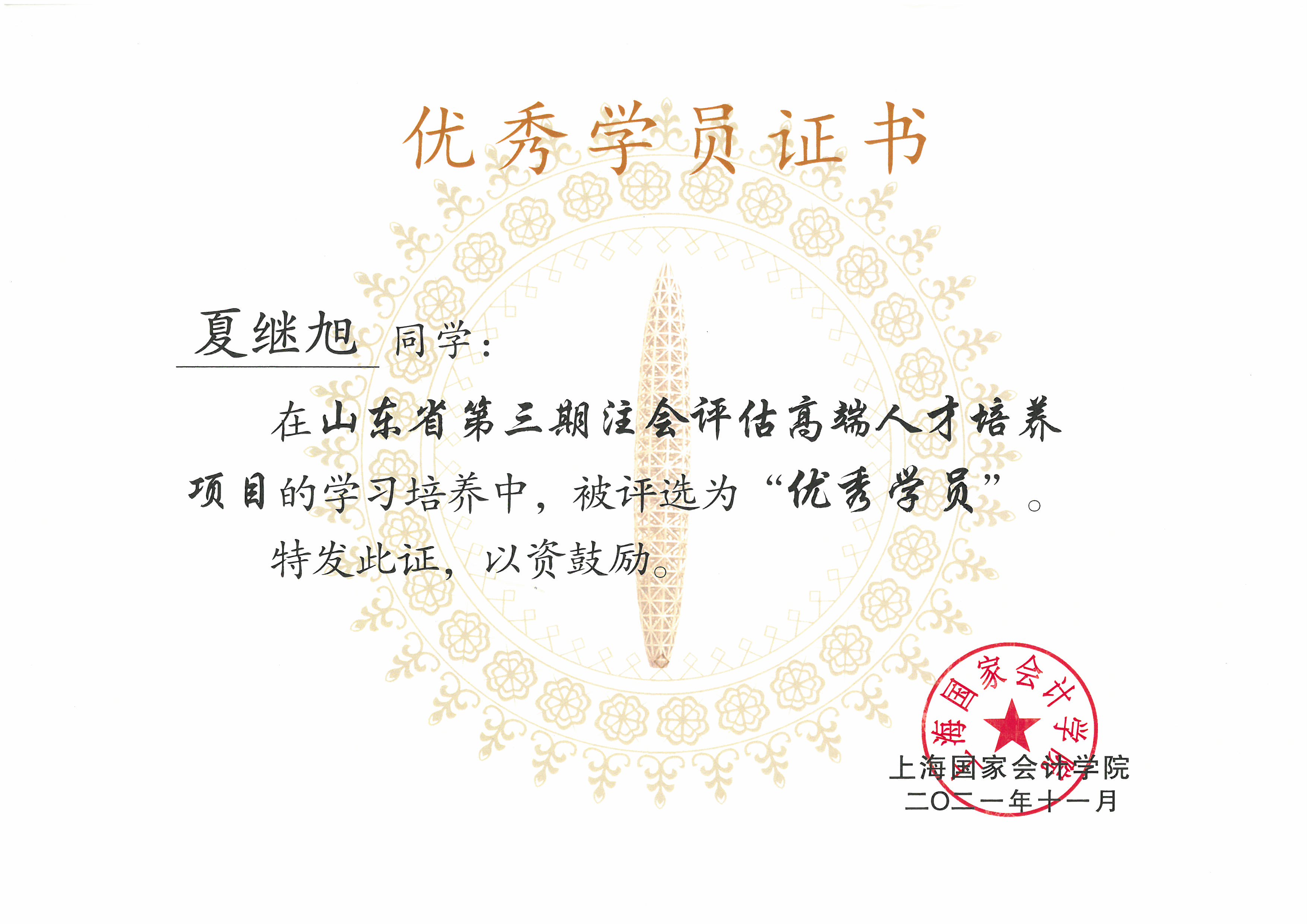 我事務(wù)所陳寶、夏繼旭、孫靜三名同志經(jīng)嚴(yán)格考核選拔為第三期高端人才培訓(xùn)人選,參加了為期三年的培訓(xùn),交出了一份出色的成績單,正式成為省高端人才,夏繼旭同志被評(píng)為優(yōu)秀學(xué)員。