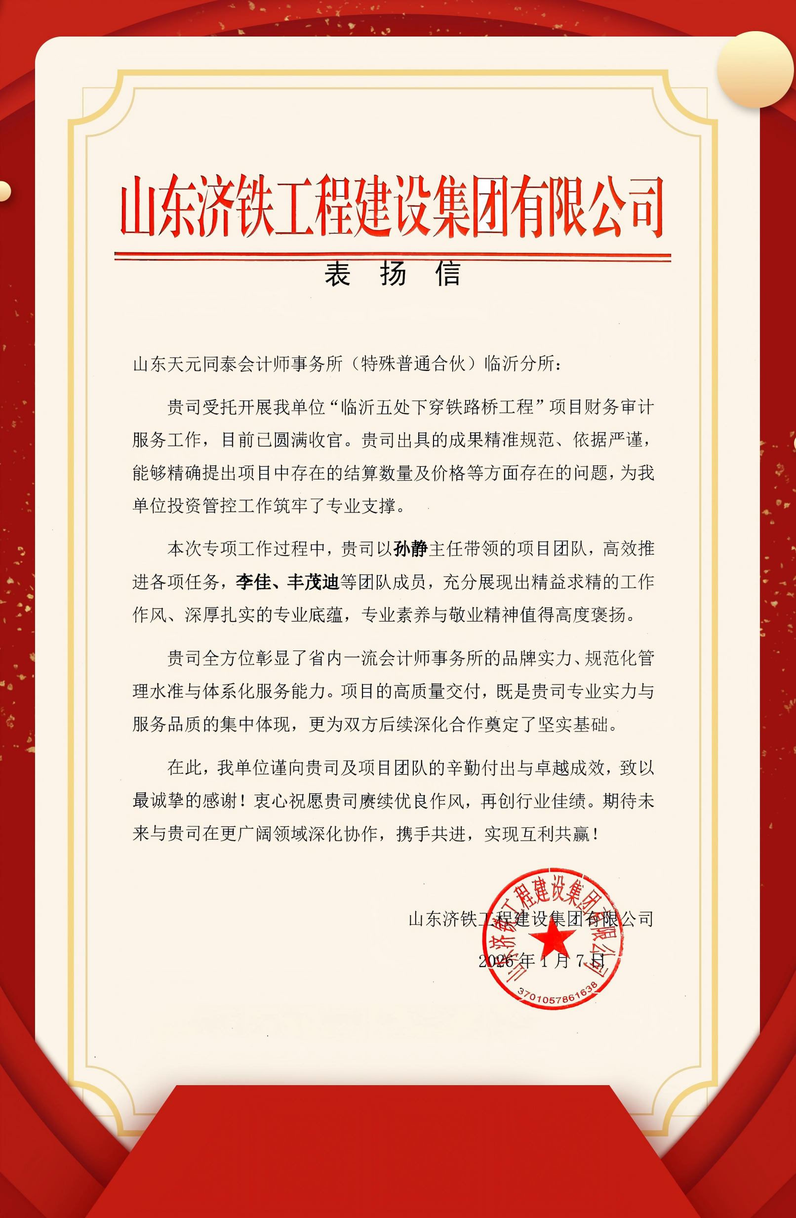 近日,山東濟鐵工程建設(shè)集團有限公司向山東天元同泰會計師事務(wù)所(特殊普通合伙)臨沂分所發(fā)出表揚信,對在“臨沂五處下穿鐵路橋工程”項目財務(wù)審計服務(wù)中的卓越表現(xiàn)給予高度評價。 本次專項工作過程中,以孫靜主任帶領(lǐng)的項目團隊高效推進各項任務(wù),李佳、豐茂迪等團隊成員展現(xiàn)出精益求精的工作作風(fēng)和深厚扎實的專業(yè)底蘊,其專業(yè)素養(yǎng)與敬業(yè)精神得到了客戶的高度褒揚。 信中充分肯定了臨沂分所項目團隊的專業(yè)能力與服務(wù)精神,贊揚其成果精準(zhǔn)規(guī)范、依據(jù)嚴(yán)謹(jǐn),在結(jié)算數(shù)量與價格等方面提出精準(zhǔn)問題,為項目投資管控提供了堅實支撐。 山東濟鐵工程建設(shè)集團在信中表示,天元同泰臨沂分所“全方位彰顯了省內(nèi)一流會計師事務(wù)所的品牌實力、規(guī)范化管理水準(zhǔn)與體系化服務(wù)能力”,并期待未來在更廣闊領(lǐng)域深化協(xié)作,實現(xiàn)互利共贏。